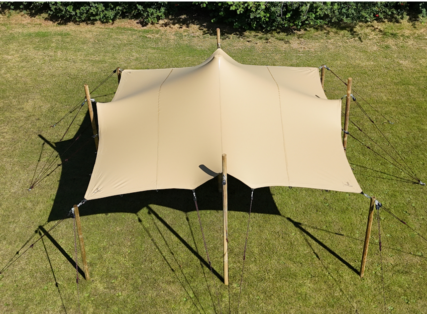 Dale a tu evento, fiesta, patio o jardín un toque veraniego y mediterráneo con esta carpa elástica de 5 x 5 m, también conocida como carpa nómada. Gracias a su tejido elástico de alta calidad (720 g/m²) y a los postes incluidos, puedes personalizar su configuración: con buen tiempo, puedes montarla con los cuatro lados abiertos; con viento, con uno o más lados cerrados; y con lluvia, puedes montarla casi completamente cerrada. Cuanto más grande sea tu carpa, más posibilidades tendrás.